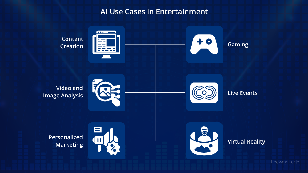 AI is seamlessly weaving its magic across the vibrant landscape of the media and entertainment industry, notably revitalizing diverse domains such as music, film and TV, gaming, advertising, book publishing, and content creation. These use cases, each unique, illustrate a panorama where technological innovation harmoniously meets creative expression, augmenting the evolution of media production, distribution, and consumption in a digital age. Let’s explore: